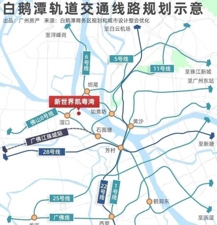 同时未来,广州首个四地铁交汇的枢纽白鹅潭站落成,1、11、22、28号四地铁交汇,还将联通佛山、深圳、东莞等湾区城市。