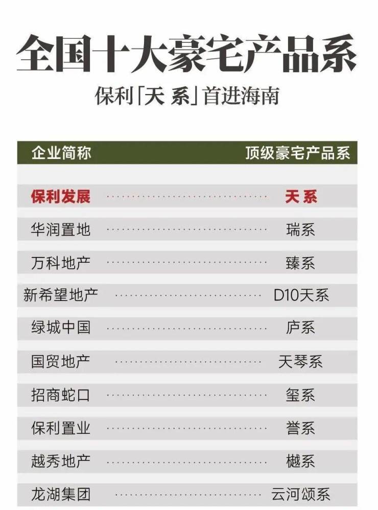 天,是保利顶级产品的价值基因。作为全国十大豪宅品系中进入海南的首位,天系,以客户需求为圆心,根据城市基座,出“甄选城芯、产品打造、服务配置”三个方面的严苛要求,因而成为保利顶级豪宅产品系。