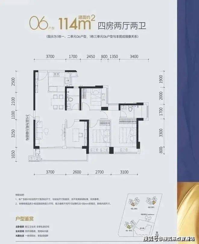 建面约114㎡四房两厅两卫:全明四开间 享充盈阳光盛景:卫浴三分离 居家清爽洁净