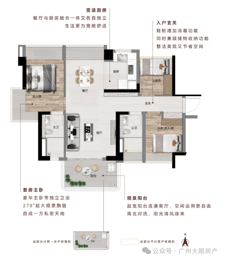 南北通透|主卧 270°飘窗+双飘窗|U 型厨房|南向观江景阳台