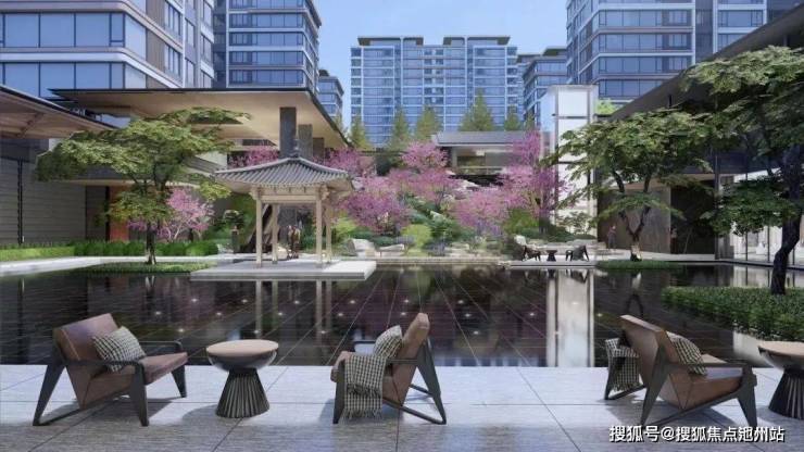 约800㎡超大面积镜面水景,置身其中,会仿佛处于《春江花月夜》中的“春江花月,浮光潮生”的深远