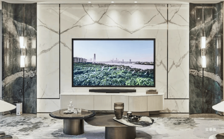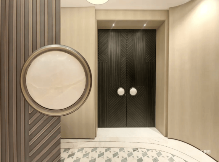传统项目大多采用的都是2.6m*1.8m的双开装甲门,而这个样板间里,项目直接在门上做了一个直径约50cm的圆形玉石辅首,推开它的时候会给人一种大权在握的掌控感。