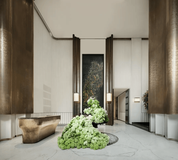 整个9.8m挑高的大堂用的是蝴蝶形圆弧倒角的黄铜墙面,将柔和的花朵和金属石材的清冷结合在一起。
