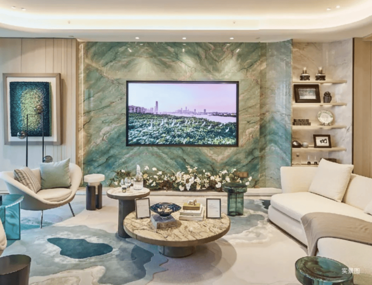 售楼处和会所是CCD做的。两层挑高,旋转楼梯两面是Prada绿的石材延续上去的。