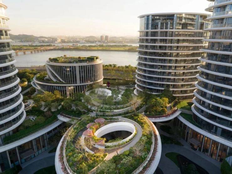 一共6幢建筑,涵盖了商业大平层、写字楼、高奢酒店、湾颂艺术中心和湾汇商业。