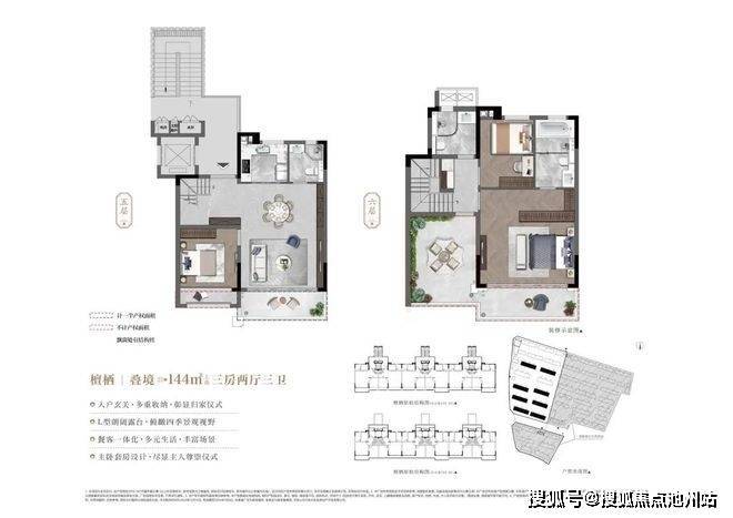 5层复合墅:垂直功能分区包含双叠层+平层单元,实现景观资源最大化利用6层组合墅:中轴区采用经典双叠层+平层结构,外围区创新设置三重立体单元