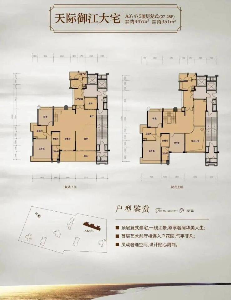 楼王华玺:A6栋1栋约32层高的版式高层洋房。四梯两户,户型面积约478㎡的超奢华五房户型。与B11同为楼王单位,户户南北通风对流,采光景观极佳,一线无敌江景;每户均特设私家入户花园,超大开间,超大阳台。