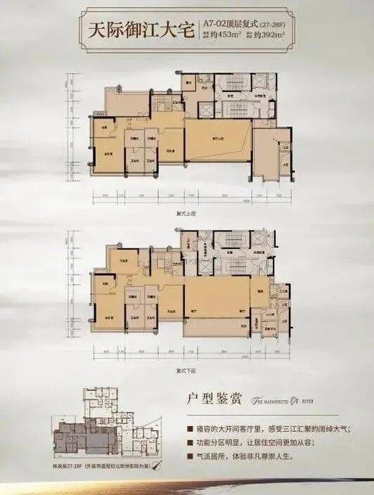 天墅产品:约28层-35层高,户型面积约360-950㎡的奢华四到五房户型;每户均特设私家入户花园,超大开间,超大阳台,无敌景观;