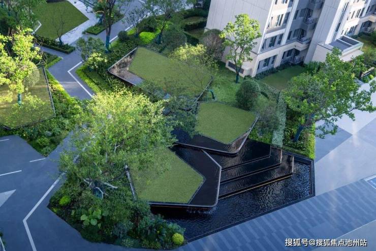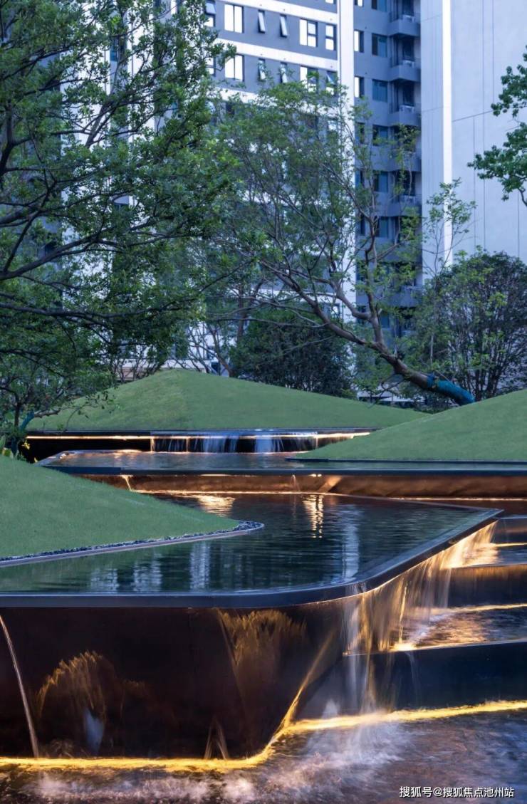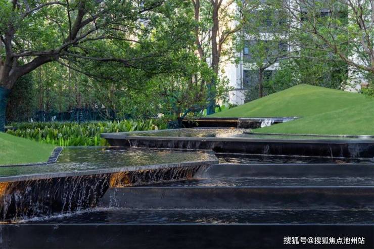 一组富有雕塑感的山形种植池交错叠置,伴随层层跌落的流水,生动诠释“之山·折水”的山水意境。