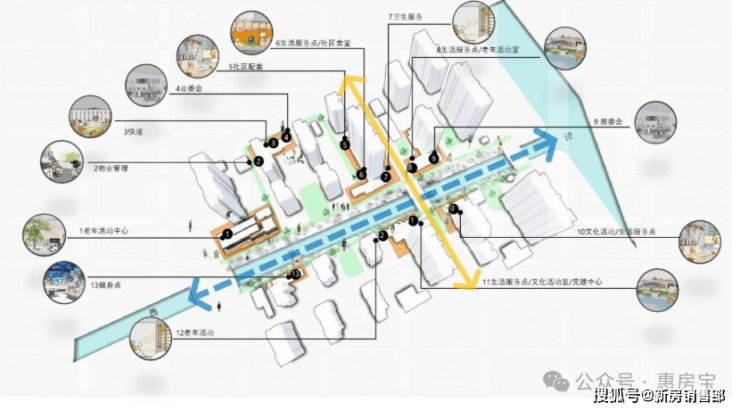 社区配套上,整个社区约3500方生活配套沿河而设,有意引入以下生活配套业态:咖啡简餐、便利店、水果店、早餐店、生鲜零售、健身瑜伽、洗衣店、药店等。在“边界消融”中,主动引导业主参与街区生活。同时,“屋檐之下,自然之家”的概念将架空层打造成“家外之家”的生活延伸,实现生活与自然的无缝衔接。还在社区10号楼和4号楼下,建立了户内户外联合,人与人情感链接的“阳光会所”。