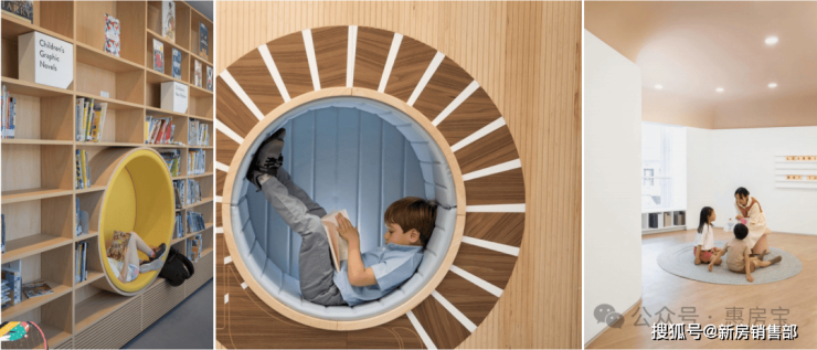沉浸式书吧就是业主的第二客厅,和亲子区动静分离。在这里,可以给业主一个舒适安静空间,以更优雅的环境享受生活,阅览着自己心仪的图书。
