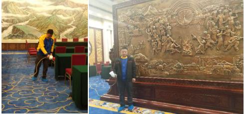 由于开会召开在即,通过中国建筑装饰装修材料协会室内环境健康净化专家委员会(简称‘环净委’)等相关渠道,有关部门找到了具有环净委甲级施工能力评价资质的北京馨立方,并经过考察后,决定于2月28日对人民大会堂云南厅地毯进行除味工作。