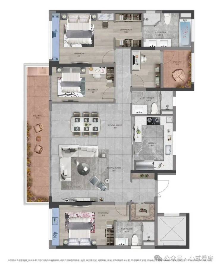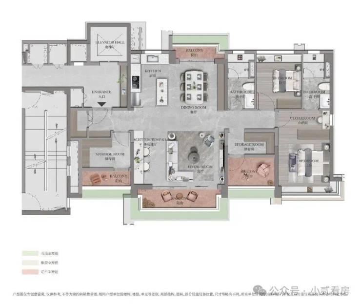 135㎡四房两厅两卫,约7m观景阳台,宽阔视野收藏中轴绿廊。