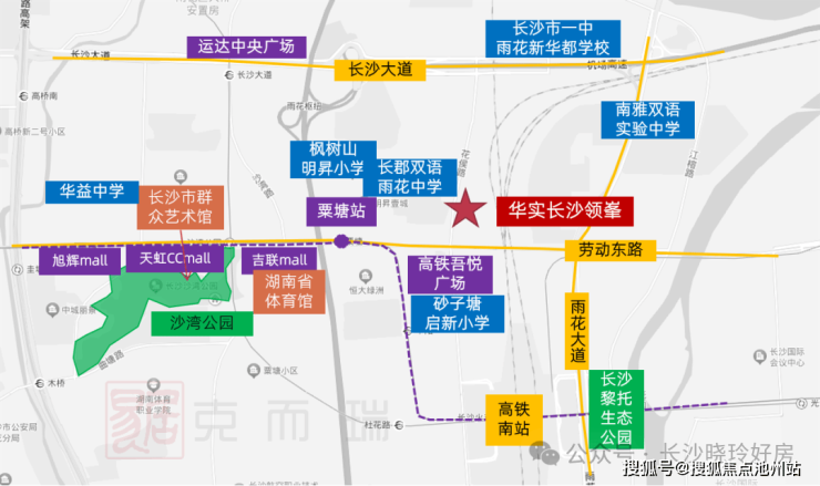 直线距离长沙高铁南站仅约一公里,临劳动东路、长沙大道,出行便利;直线距离4号线粟塘站约800米,根据后期地铁规划,地铁环线8号线劳动东路站,临近社区大门,畅达全城。