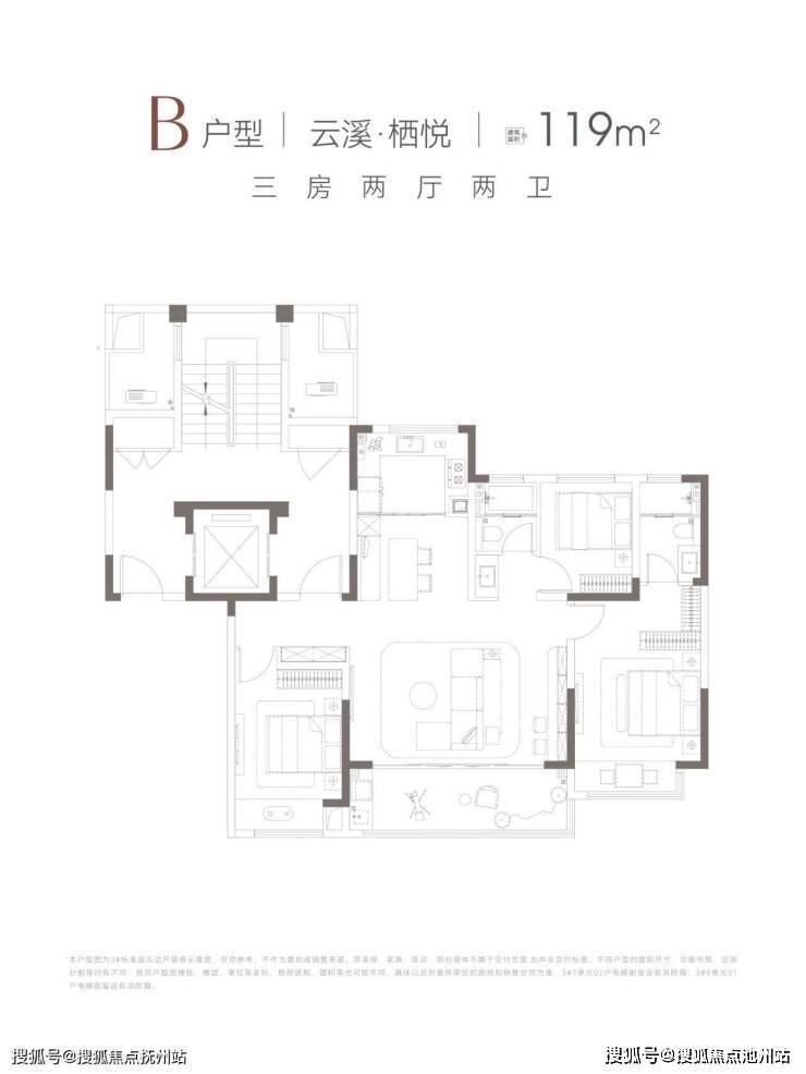 119㎡三房:一梯两户对开门设计,私密性与归家仪式感兼备;约12.4米南向开间,搭配大面宽阳台,采光与视野出色。