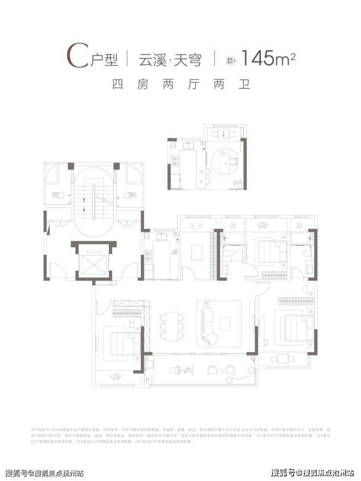 145㎡四房:一梯一户独立电梯入户,奢阔阳台与客厅无缝连接,空间阔绰;主卧套房设计,配备独立卫浴与衣帽间。