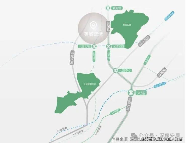 交通配套:美域蓝湾交通网络完善,形成多层次、高效的出行体系。距离地铁16号线龙城公园站约1.3公里(步行15分钟),2站可达大运枢纽站,可换乘3号线、14号线及深大城际(设计时速160km/h,2026年开通)。