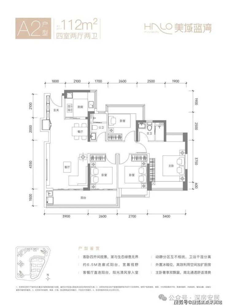 112㎡的4房2厅2卫,A2户型,设计的是竖厅南北通透格局,进门入户玄关,客厅3.9米开间,LDKB一体化设计,S墙设计预留冰箱卡槽位,动静分区,客厅连接次卧出6.5米长的大阳台约9.74m²,U型厨房,卫生间干湿分离,得房率约80.12%(不含赠送),西南或东北朝向。