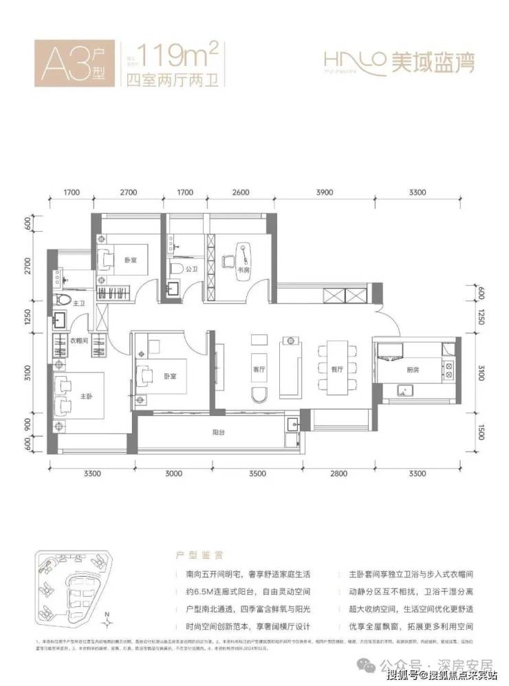 119㎡的4房2厅2卫,A3户型,设计的是横厅南北通透格局,进门入户玄关,客餐厅6.3米开间,LDKB一体化设计,五开间朝南,客厅连接次卧出6.5米长的观景大阳台约9.75m²,U型厨房,卫生间干湿分离,得房率约80.12%(不含赠送),阳台主朝东南向。建筑面积95.34m²+赠送面积18.07m²=实用面积113.41m²,加上赠送得房率95.3%。