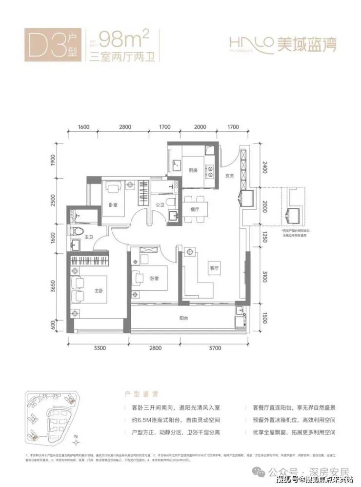 98㎡的3房2厅2卫,D3户型,设计的是经典竖厅格局,客厅3.7米开间,LDKB一体化设计,S墙设计预留冰箱卡槽位,动静分区,客厅连接次卧出6.5米长的大阳台约9.75m²,U型厨房,卫生间干湿分离,得房率约80.12%(不含赠送),东南朝向。