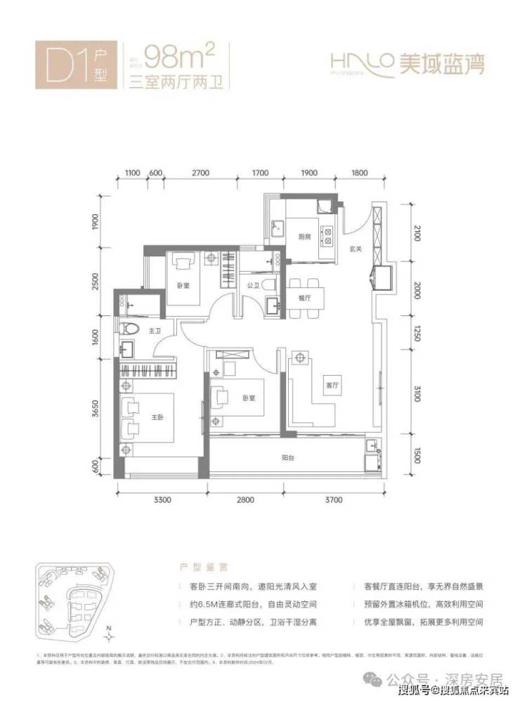 98㎡的3房2厅2卫,D1户型,设计的是经典竖厅格局,客厅3.7米开间,LDKB一体化设计,S墙设计预留冰箱卡槽位,动静分区,客厅连接次卧出6.5米长的大阳台约9.75m²,U型厨房,卫生间干湿分离,得房率约80.12%(不含赠送),西南或东北朝向。