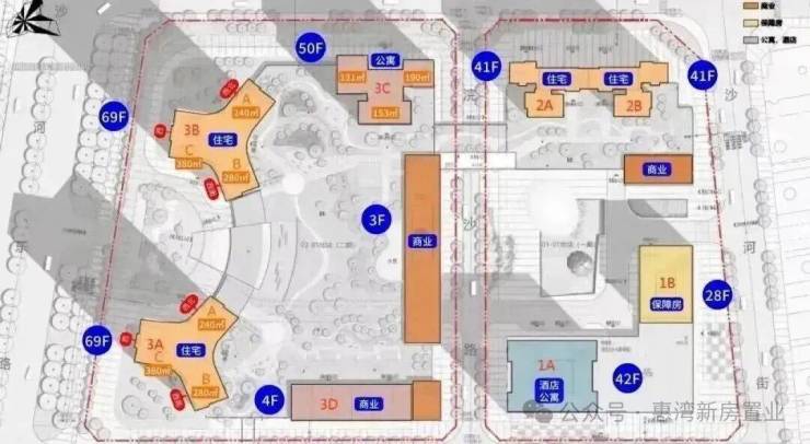 总栋数:8栋(一期:1A栋42层酒店+公寓、1B栋28层保障房,2栋1/2单元41层回迁住宅;二期:3A/3B栋67层住宅;3C栋50层公寓、3D栋4层公寓)。