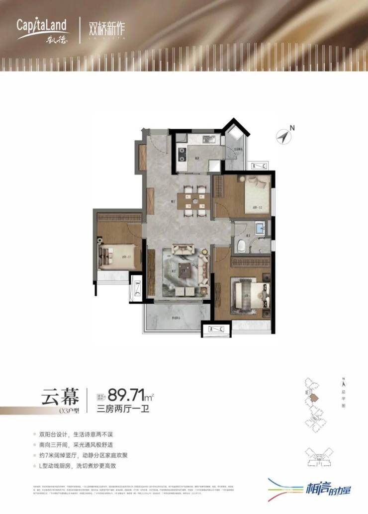 双桥新作规划三栋住宅,共411套精品住宅,户型涵盖74-128㎡二至四房,多样化的户型产品满足不同客户需求,同时打造层次丰富的园林景观,配置全龄活动空间,全新概念的空中跑道。