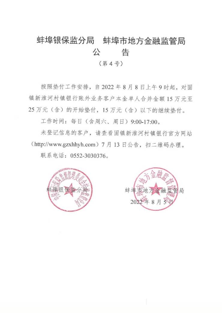 同日,安徽蚌埠银保监分局、地方金融监管局发布公告称,按照垫付工作安排,自2022年8月8日上午9时起,对固镇新淮河村镇银行账外业务客户本金单人合并金额15万元至25万元(含)的开始垫付,15万元(含)以下的继续垫付。