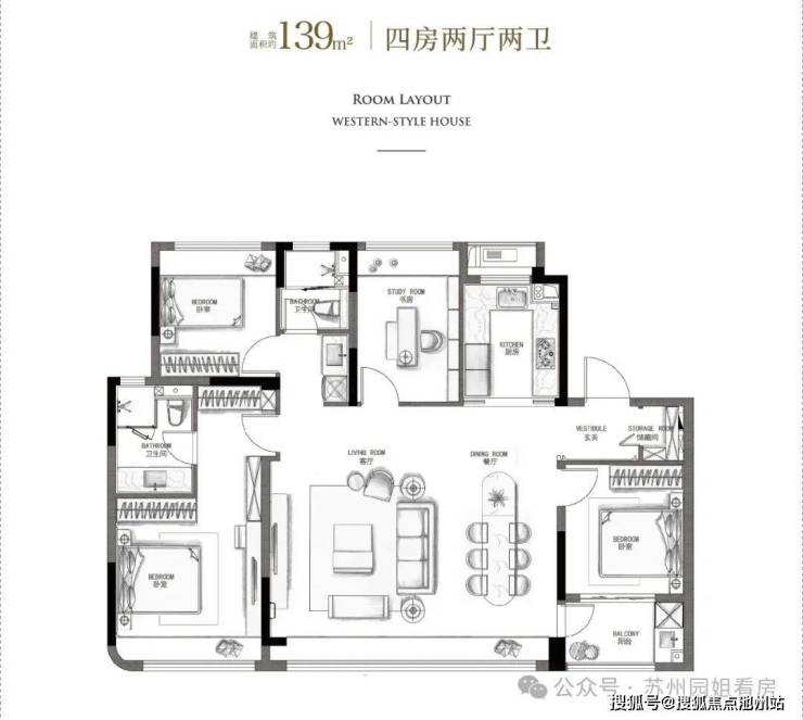 约139㎡户型图,4房2卫,做了当下比较流行的约7.2米大横厅,客厅和阳台打通,将功能阳台置于朝南次卧。