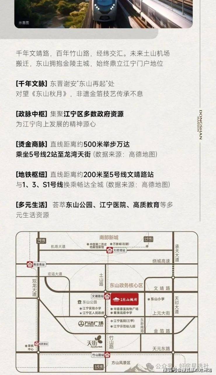 地理位置优越:中建东山樾府位于江宁区东山板块,文靖路和东沟巷交汇处,距离地铁 5 号线文靖路站仅约 200 米。周边交通网络发达,可与地铁 1、3、S1 号线无缝换乘,快速畅达南京各处。同时,项目紧靠江宁区政府,集聚了江宁区 90% 的政府资源,是江宁真正意义上的政脉中心。