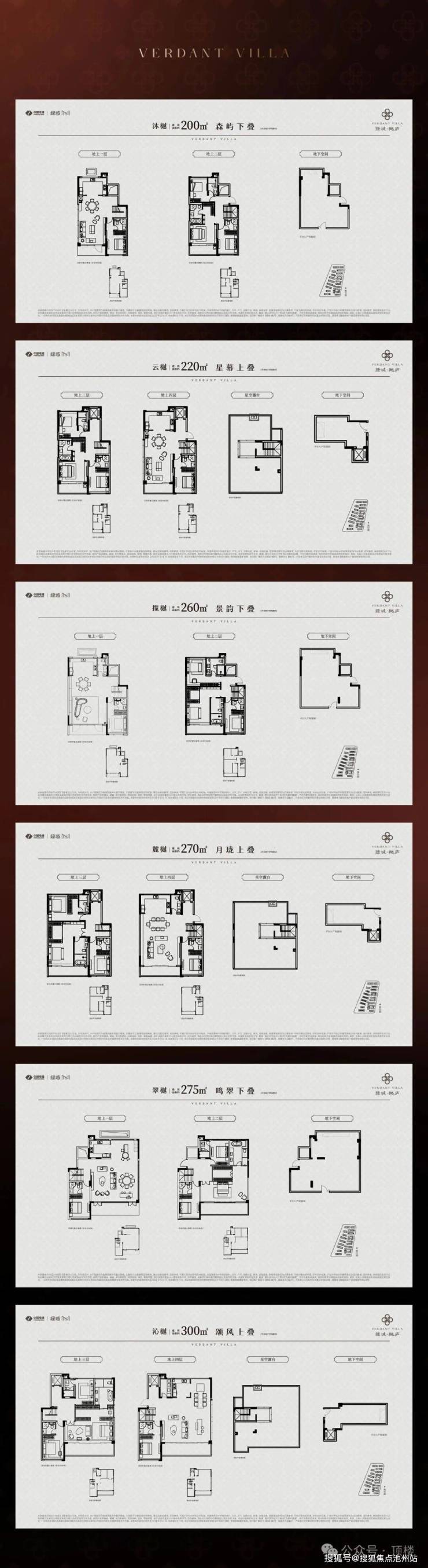 •整体规划打造建面约285-325㎡山水合院(2-3F)、建面约200-300㎡诗境叠墅(4-6F)