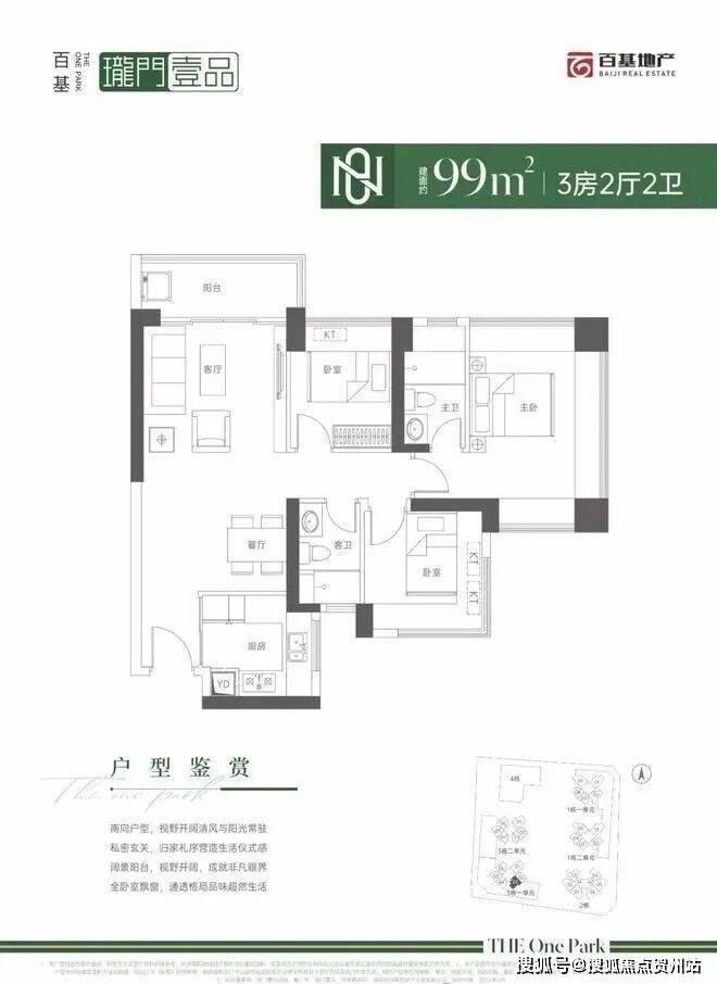 99㎡的3房2厅2卫,设计的是经典竖厅格局,进门入户玄关,客厅3.9米开间,LDKB一体化设计,动静分区,四开间朝南,主卧三面飘窗,U型厨房,卫生间干湿分离,得房率:71.29%(不含赠送),东南朝向。