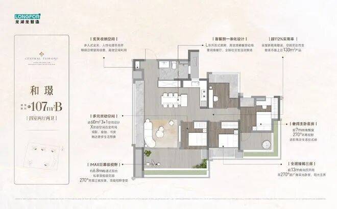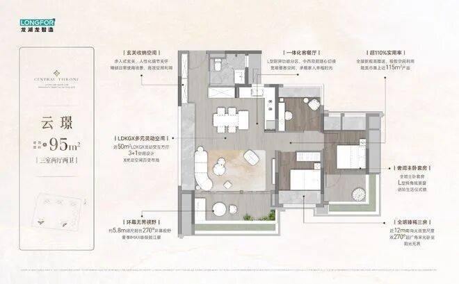 龙湖亚伦·央璟颂提供的户型面积从95平方米到139平方米不等,适合各种家庭结构。每个户型都采用了近270°转角大飘窗设计,拥有超高窗墙比,确保每一户都能享受到充足的自然光线和壮丽的江景视野。特别是部分户型还配备了宣纸玻璃和天然石材装饰,使室内更加奢华。