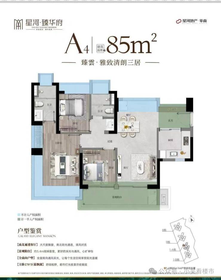 建面85平三房,约100%使用率,LDKG一体化设计,约11.6米南向采光面,三间房都是南向,主卧带270度转角飘窗,总价215万起。