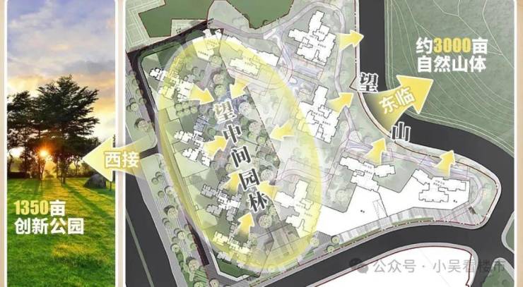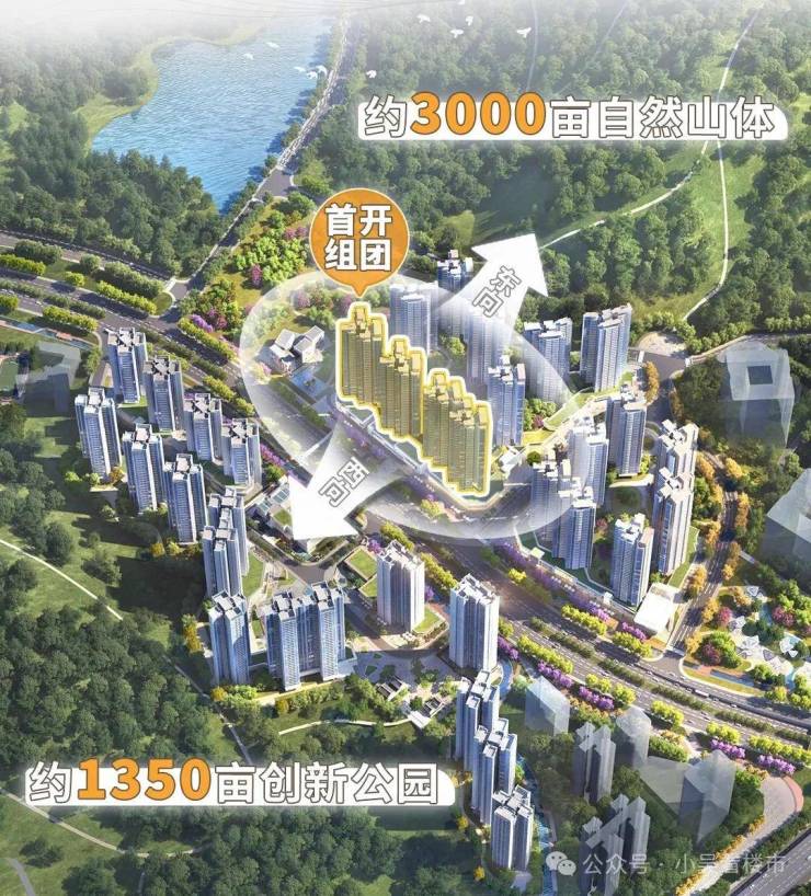 项目东面有约3000亩自然山体,西瞰约1350亩创新公园,双山环绕,如同天然隔音屏障,更将带来约20倍珠江公园的负氧离子,自带了约1万㎡古树公园,加上创新公园的绿意,与小区内嵌的园林秘境,三园共生,每一次归家都是一次自然与美图暴击。