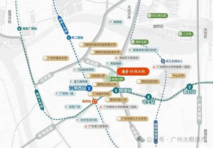 距离地铁8号线晓港地铁站仅0.6km,8号线可以直达琶洲、客村等商务圈,一站到昌岗可以换乘2号线,到南站、白云新城也比较方便,三站客村换乘3号线,到珠江新城、体育西路,能实现40min内通勤。