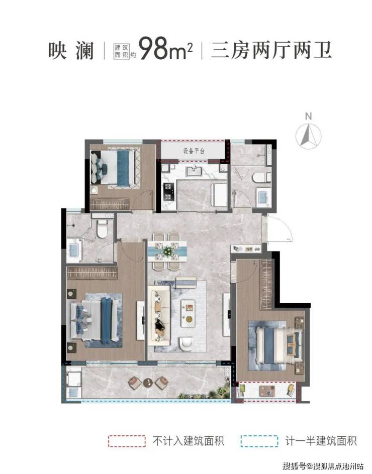 建面约98㎡的三房两厅两卫,约9.9米超大面宽,南向三开间,奢阔的尺度,让生活无缝贴近阳光。 开放式的餐客厅,一体直通阳台,打破空间的隔阂,与风光无界。 约6.9米宽幕阳台,既可莳花弄草,也可满足日常生活的需要,让浪漫融入每一天。