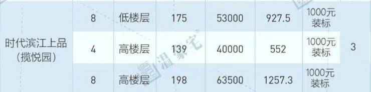 小区一共三个地块,滨江上品(揽悦园)是先开盘的,于2019年8月-2020年1月,共开盘3期,推售960套房源,主力面积段约132-260㎡,开盘毛坯均价约3.3-5万元/㎡。装标为1000元/㎡,赠送。