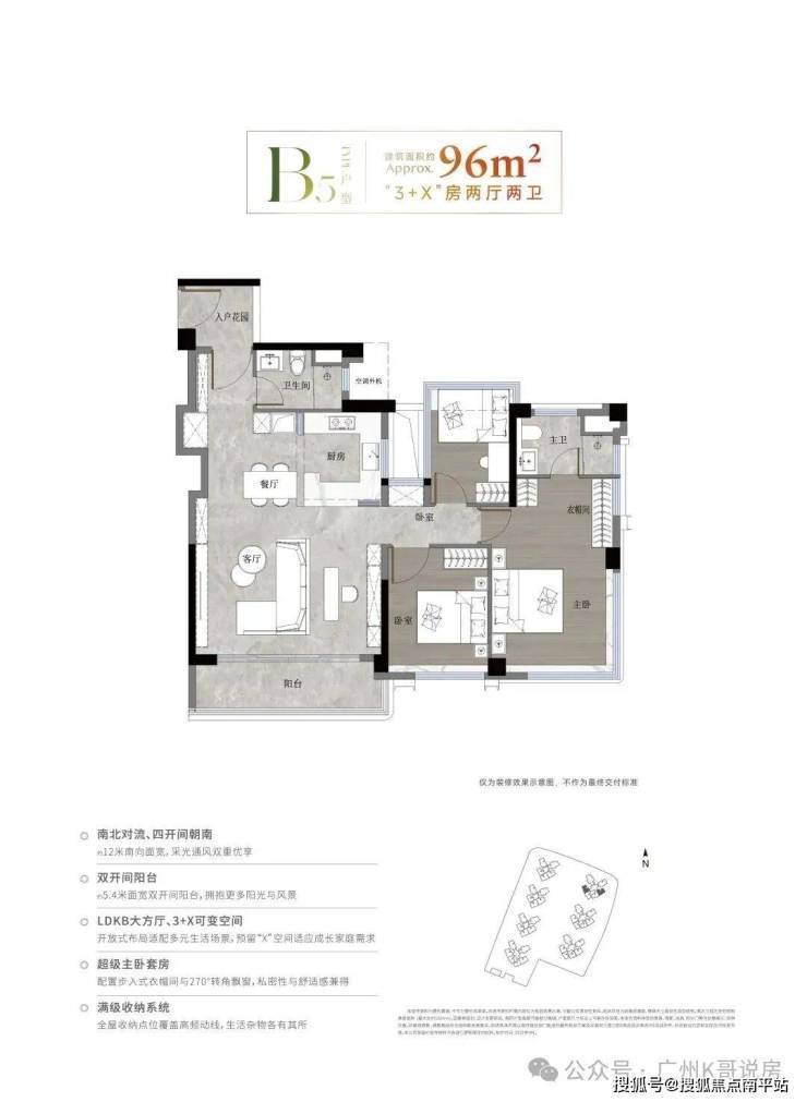 【建面约 96 ㎡ 3+X 房两卫】建面使用率高达 110-118%(套内使用率 138-148%),使用面积约 111-115 ㎡,