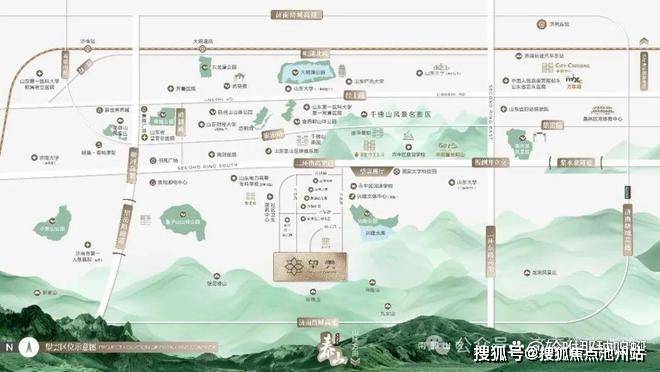 项目位于大明湖-千佛山-泰山的泉城南北特色风貌轴南段,地块肌理形如天然如意,周边三山一水环绕,围合宜养宜居的生态福地。