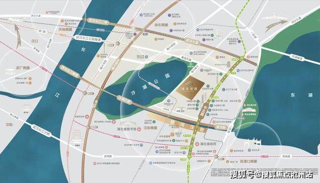 项目地块与中北路、沙湖大道为邻,快速通达全城。更一线直面沙湖全景,揽胜约10km湖岸线上的四季风情。华中金融主轴、武昌政务主轴、中央商业主轴三大主轴鼎立,周边多重商圈环绕,武汉SKP、楚河汉街近在咫尺,一城高阶资源精粹于此。