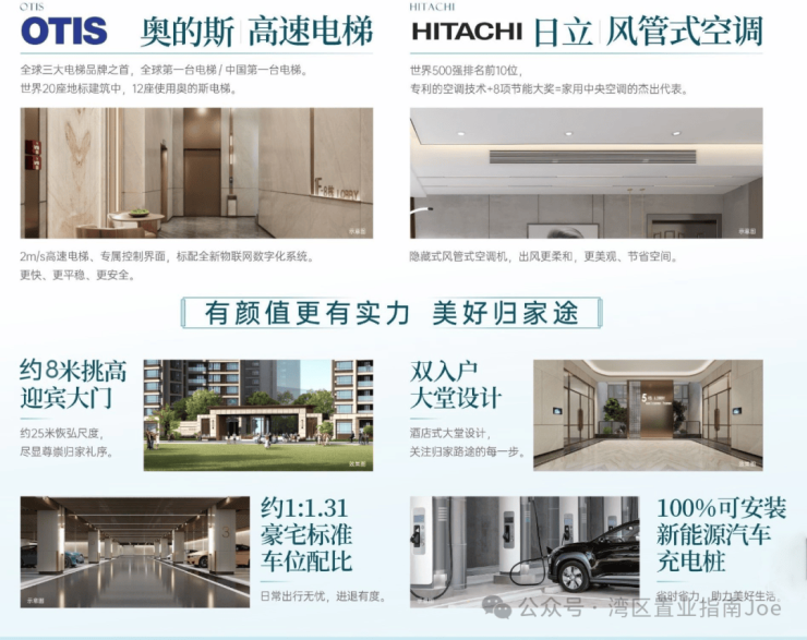 项目主入口门楼高约 8 米、宽 25 米,采用双入户大堂设计,大堂地面与墙面铺设奢华石材;地下车库采用环氧地坪漆与铝格栅吊顶,搭配内嵌式柔和灯光;住宅层高为 3 米,室内开窗面与阳台设计较宽,部分户型可俯瞰滨江景观;电梯选用全球排名前列的奥的斯品牌,整体细节兼顾美观与实用。
