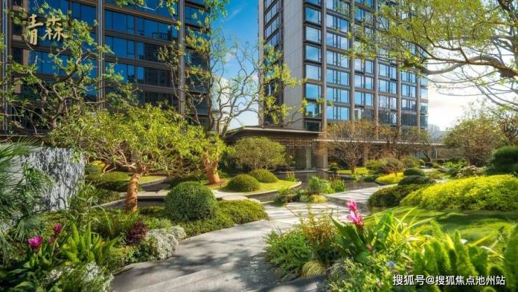 景观上,打造了实景呈现的成熟园林绿化,”四时四感“的设计,让园区内四季都有植物盛开,四季可观可赏,坐在下沉式看景会客厅,仿佛置身于高奢酒店之中。