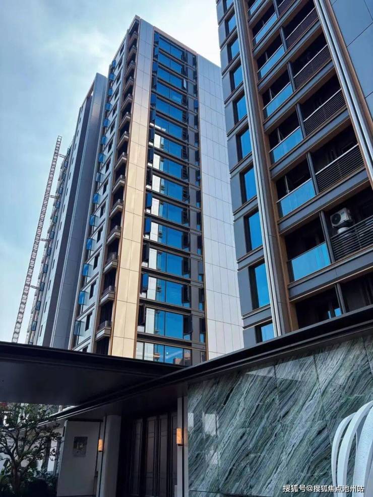 我站在大门口,看到小区楼幢全部封顶,外立面“完全呈现”,看着四面大面积铝板+玻璃的实景质感,很美很有辨识度。