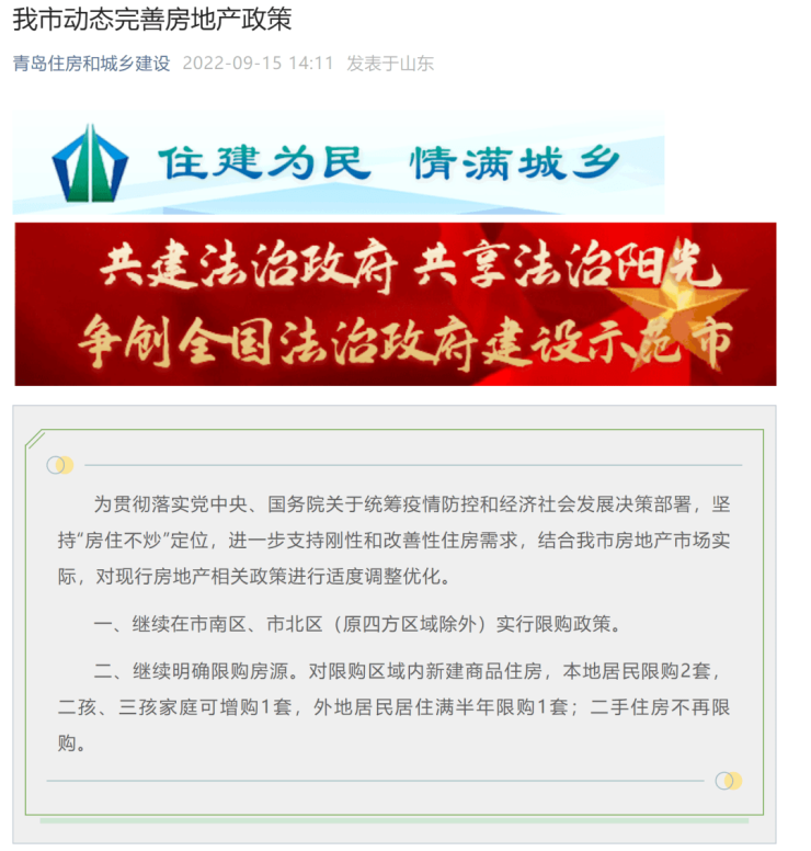 焦点财经讯 李泳青 9月15日,青岛住房和城乡建设局发布消息称,将继续在市南区、市北区(原四方区域除外)实行限购政策。