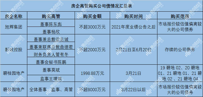同日,碧桂园率先将计划付诸实践,宣布截至3月21日,其董事及监事购买债券为“19 碧地 02”、“20 碧地 01”、“21 碧地 01”、“21 碧地 02” 和“21 碧地 04”,累计购买金额1998.88万元。