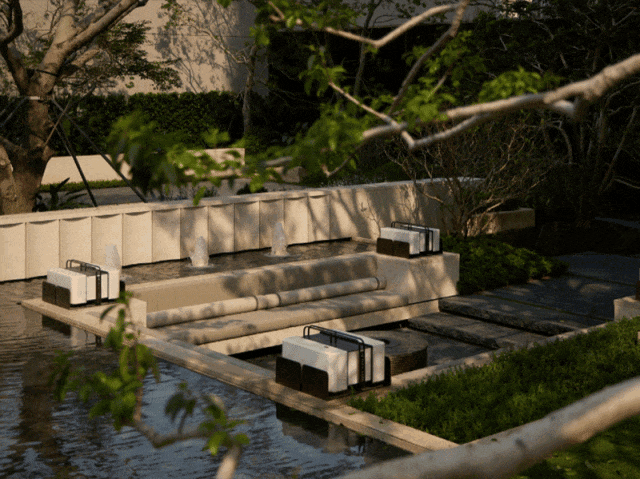再比如中央园林,借鉴岭南园林风格融入现代空间美学,再搭配整块天然奢石打造的背景墙,在光影交错间尽显质感。