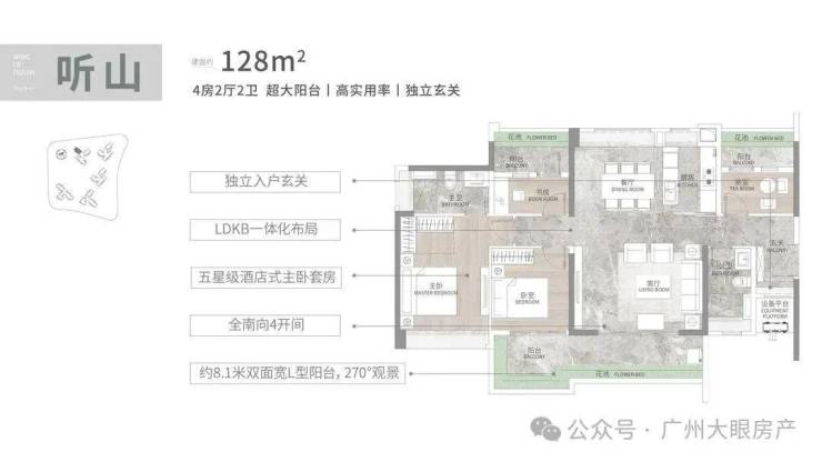 建面108平3+1房,四开间朝南,近6米的南向阳台,270度景观,LDKB一体化设计,5.9米的大方厅,奢阔大主套设计,配置南向大飘窗,独立卫浴,L型衣帽间