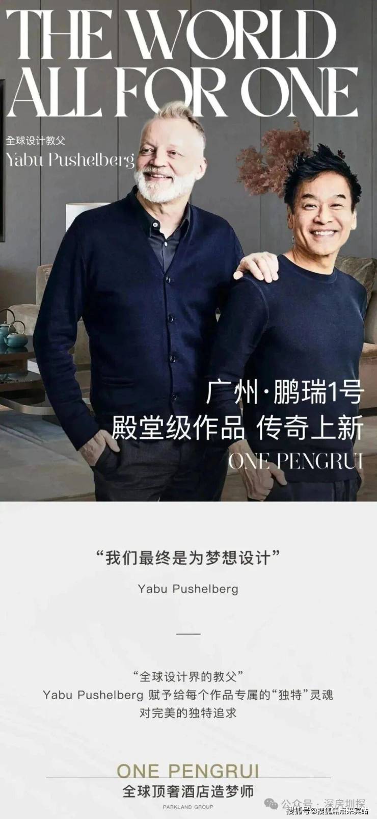 鹏瑞集团是中国高品质生活的引领者,打造超级城市滨海地标综合体——深圳湾 1 号,是享誉世界的豪宅标杆之作。创始人徐航先生,出生广州,希望在故乡打造一座具有世界影响力的建筑地标,遍访全球顶级豪宅,打造全面超越深圳湾1号的作品——广州·鹏瑞1号。
