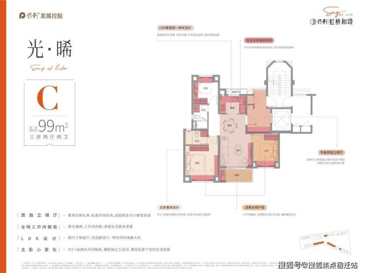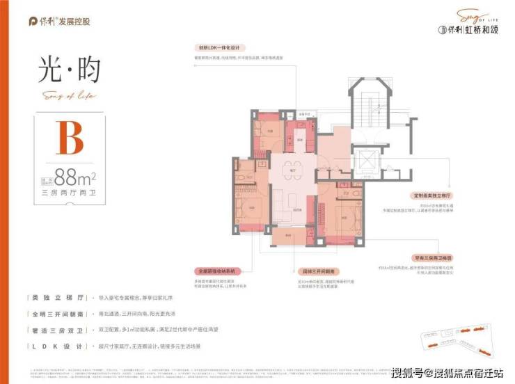 臻奢建面约88㎡/99㎡户型,专属定制类独立梯厅,让生活拥抱私密和尊崇,LDK餐客厨一体化设计,动线流畅,链接多元生活场景,南北通透三开间朝南设计,承载生活更多浪漫。
